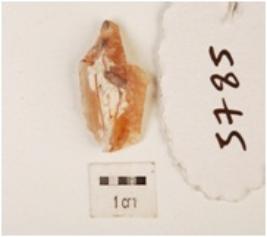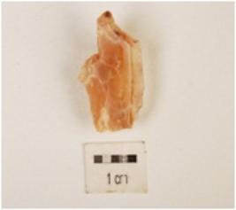 | Description / विवरण | A flake made on chalcedony, flake scars on dorsal side surface, cortex on one side surface, use wear marks along cutting edge, platform and bulb absent, trapezoidal in section. |