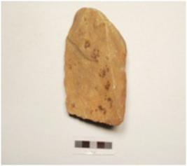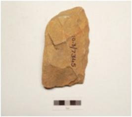 | Description / विवरण | Shaped cleaver made of quartzite, end struck flake, bulb absent flat broad cutting edge, flat butt end, flake scars on one surface, triangular in section. |