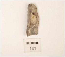 | Description / विवरण | A utilized flake made on chert, use wear marks along cutting edge, triangular section, flake scars on dorsal side surface, platform and bulb absent. |