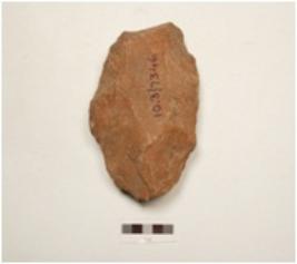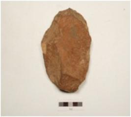 | Description / विवरण | Ovate shaped handaxe made of quartzite side struck flake, bulb absent, wavy cutting edge, flake scars on both surfaces, plain convex in section. |