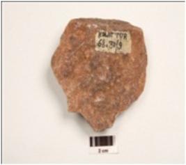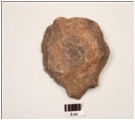 | Description / विवरण | A bifacial chopping tool made on quartzite pebble, wavy cutting edge on the anterior, flat butt end on the posterior, trapezodial in section. |