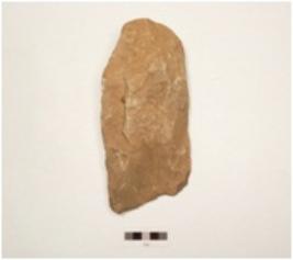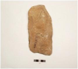 | Description / विवरण | Shaped cleaver made of quartzite, end struck flake, bulb absent, flat broad cutting edge, round butt end partly retouched cutting edge, flake scars on both surfaces, plain convex in section. |