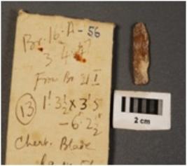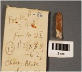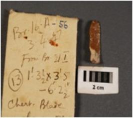 | Description / विवरण | Chert blade with a striking platform at proximal end with a positive bulb on ventral side, use wear marks on working edge, broken distal end. |