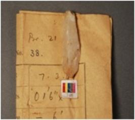 | Description / विवरण | Quartz blade with a clear middle ridge on dorsal surface, use wear mark on one working edge and broken on other edge. Proximal and distal end broken. |