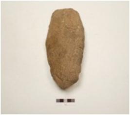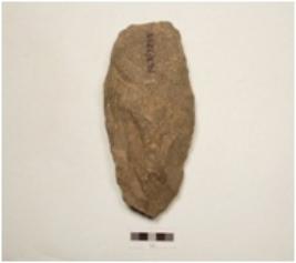 | Description / विवरण | A handaxe made of quartzite end struck flake, bulb absent, broad at butt end, pointed other end, wavy cutting edge, flake scars on both surfaces, plain convex in section. |