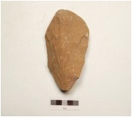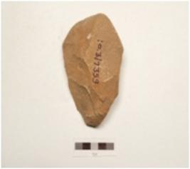 | Description / विवरण | A miniature handaxe made of quartzite pebble, flat broad at butt end cortex on butt end, intact other end, wavy cutting edge, flake scars on both surfaces, diamond shape in section. |