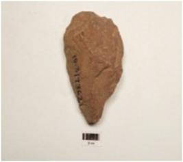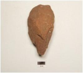 | Description / विवरण | A miniature handaxe made on quartzite, end struck flake, bulb absent, wavy cutting edge, flake scars on both surfaces, broad butt end, pointed other end plain convex in section. |