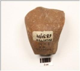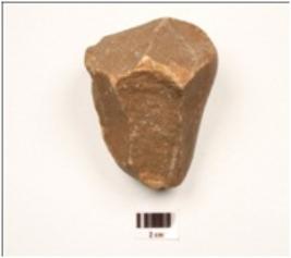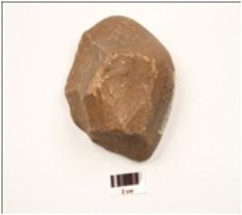 | Description / विवरण | A bifacial chopping tool made on quartzite pebble, wavy cutting edge on the anterior, round butt end posterior, convex in section. |