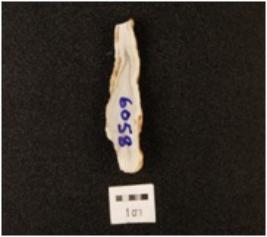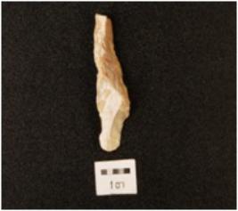 | Description / विवरण | A blade, made on chert with prominent wavy mid-ridge on dorsal side, prepared platform, bulb on ventral, broken along distal end and triangular in section, use-wear marks on cutting edge. |