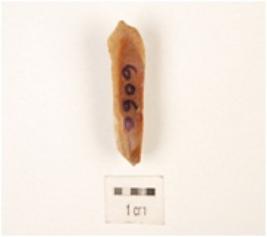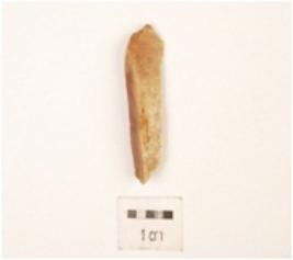 | Description / विवरण | A blade, made on chert with prominent mid-ridge on dorsal side, cortex on dorsal side, use-wear marks on cutting edge and triangular in section. |
