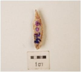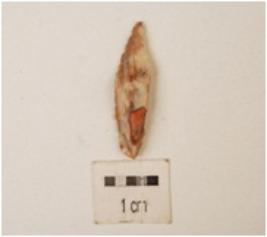 | Description / विवरण | A blade made on chert with double ridge on dorsal side, triangular in section and use-wear marks on cutting edge. |
