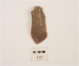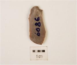 | Description / विवरण | A flake made on chert with flake scars on dorsal side, prepared platform, bulb on ventral and broken edges. |
