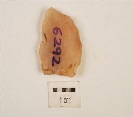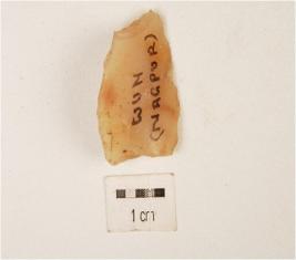 | Description / विवरण | A chalcedony end struck flake, prepared platform, prominent bulb on ventral side, triangular in cross section and use-wear marks along the cutting edge. |