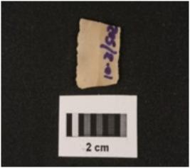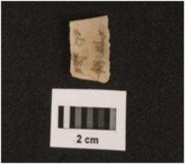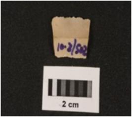 | Description / विवरण | A chert blade with a mid ridge on dorsal side, triangular section, used wear mark on cutting edges. |