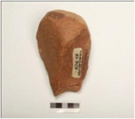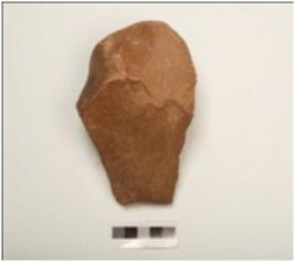 | Description / विवरण | A bifacial chopping tool made on quartzite pebble with thick butt end on posterior, prepared platform, oval in section, pointed tip and slightly broken along distal end. |