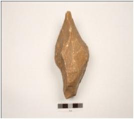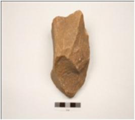 | Description / विवरण | Chopper tool made on quartzite pebble, flake scars on both surface, cutting edges, cortex visible, diamond in section. |