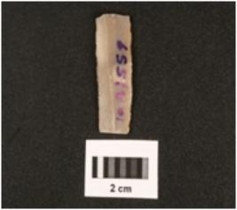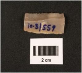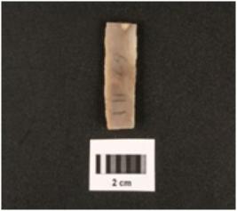 | Description / विवरण | Chert blade with use-wear marks on cutting edges, mid-ridges on dorsal side, triangular in section from one edn and trapezoidal from other, smooth surface. |