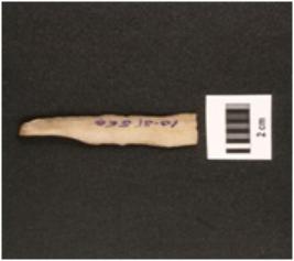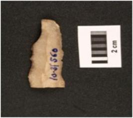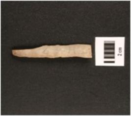 | Description / विवरण | Fragment of parallel sided chert backed blade, irregular retouches on both sides, diffused bulb on ventral side, two ridge on dorsal side, trapezoidal in section. |