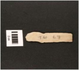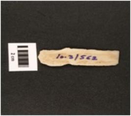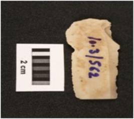 | Description / विवरण | Chert blade with use-wear marks on cutting edges, smooth surface with two ridges on dorsal side, prominent bulb, trapezoidal in section. |