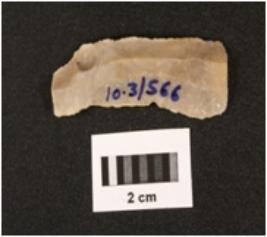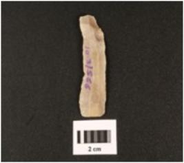 | Description / विवरण | Chert blade with use-wear marks on cutting edges, two prominent ridges on dorsal side, trapezoidal in section. |