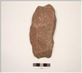 | Description / विवरण | Cleaver made on end-struck quartzite flake, positive bulb on ventral surface, flake scars on dorsal surface, striaght working edges, rectangular in section. |