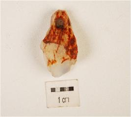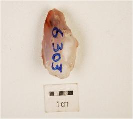 | Description / विवरण | A chalcedony core with flake scars and cortex on one side. |