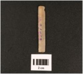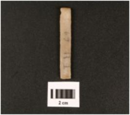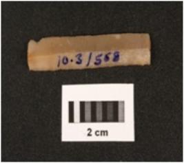 | Description / विवरण | Chert blade with use-wear marks on cutting edge, prominent mid rdige on dorsal side, diffused bulb, triangular in section. |