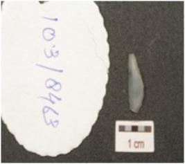 | Description / विवरण | A blade made on chalcedony ridge on dorsal side, partly retouch cutting edges and slightly pointed end. |