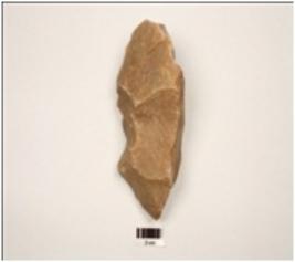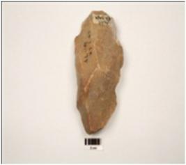 | Description / विवरण | Handaxe made on end struck quartzite flake, trinagular in section, bifacial, flake scars on both surface, wavy cutting edges, pointed at one end. |