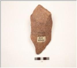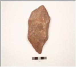 | Description / विवरण | Handaxe made on end struck quartzite flake, wavy cutting edges, flakes scars on one surface, cortex visible, pointed at one end, triangular in section. |