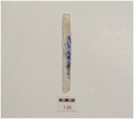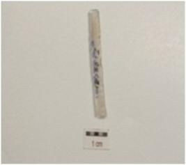 | Description / विवरण | Chalcedony blade with mid-ridge on dorsal side, and diffused bulb on ventral, use wear marks along cutting edges and triangular cross section. |