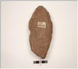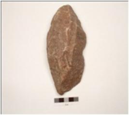 | Description / विवरण | Handaxe made on end-struck quartzite flake, flake scars on one surface, triangular in section, wavy cutting edges, pointed at one end, narrow butt end. |