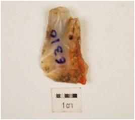 | Description / विवरण | A chalcedony flake made on endstruk, prepared platform, prominent bulb on ventral side and cortex partly intact on dorsal side. |