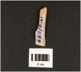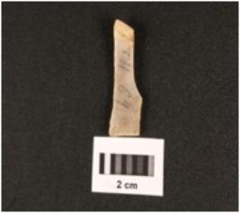 | Description / विवरण | Fragment of parallel sided chert blade with use wear marks on cutting edges, trapezoidal in section, ridges on dorsal side, cartex visible, diffused bulb on proximal end. |