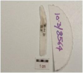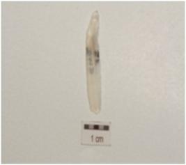 | Description / विवरण | Chalcedony blade with double ridge on dorsal side and diffused bulb on ventral side, trapezoidal in cross section and use wear marks along cutting edges. |