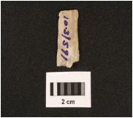 | Description / विवरण | Fragment of parallel sided chert blade with use wear marks on cutting edges, two ridges on dorsal surface, trapezoidal in section, diffused bulb on ventral side. |