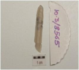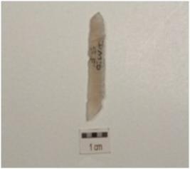 | Description / विवरण | Chalcedony blade with striking platform, double ridge on dorsal side and prominent bulb on ventral side, trapezoidal in cross section and use wear marks along cutting edges. |
