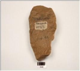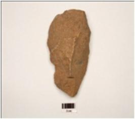 | Description / विवरण | A handaxe made on end struck quartzite flake, partly broken from one end, flake scars on one side, triangular in section, use-wear marks on cutting edges. |