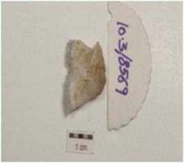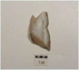 | Description / विवरण | Flake on chalcedony with flake scars on dorsal side and diffused bulb on ventral side, use-wear marks along cutting edge and triangular in section. |