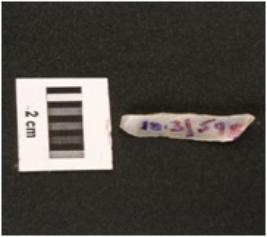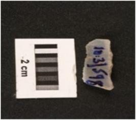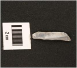 | Description / विवरण | Fragment of parallel sided chalcedony backed blade, ridge on dorsal surface, irregular retouch left side,a prominent bulb on proximal end, distal end broken. |
