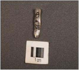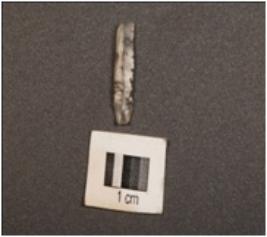 | Description / विवरण | A chalcedony blade with two-ridges on dorsal surface, triangular section, use-wear marks along the cutting edges and diffused bulb on ventral surface. |