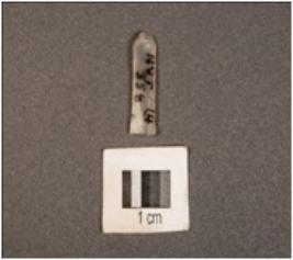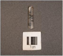 | Description / विवरण | A chalcedony blade with two-ridges on dorsal surface, trapezoidal section, diffused bulb on ventral surface, distal end broken and use-wear marks along the cutting edges. |