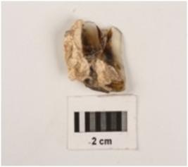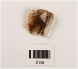 | Description / विवरण | Fragment of chalcedony blade, with use wear marks on cutting edges, cortex on dorsal side, prominent bulb on proximal end, ridge and ripple marks on dorsal side. |