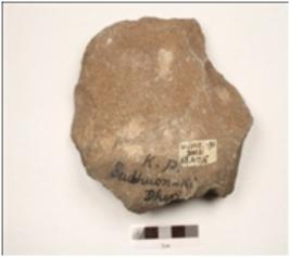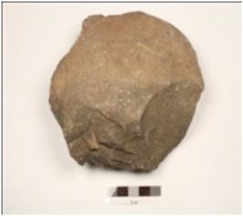 | Description / विवरण | A bifacial chopping tool made on granite pebble, wavy cutting edge on the anterior, thick butt end at posterior, flake scars on both sides, convex in section. |