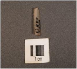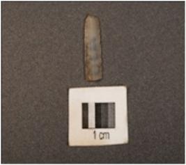 | Description / विवरण | A chalcedony blade with mid-ridge on dorsal surface, triangular section, distal end broken and use-wear marks along the cutting edges. |