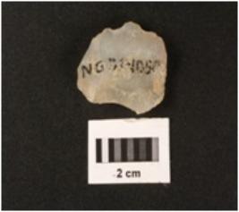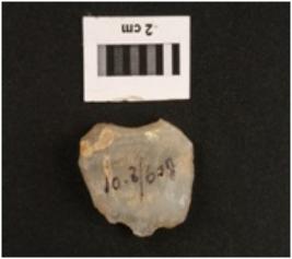| Description / विवरण | A chalcedony flake, prominent bulb on ventral side, irregular retouch on left side. |
