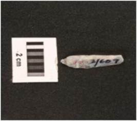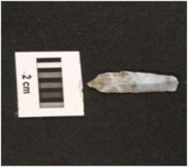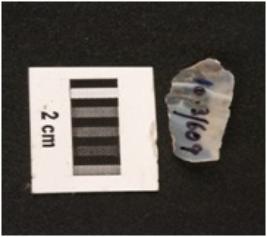 | Description / विवरण | Fragment of parallel sided chalcedony blade, with use wear marks on cutting edges a mid ridge on dorsal side, diffused bulb on ventral side. |