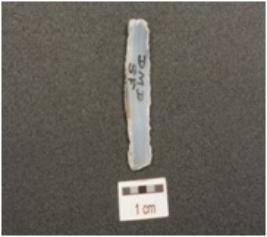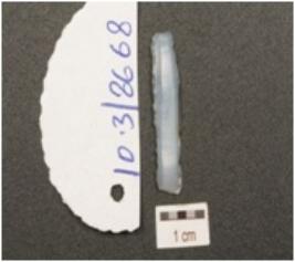| Description / विवरण | A double ridged blade made on chalcedony, prepared platform, prominent bulb at ventral side and denticulated working sides. |