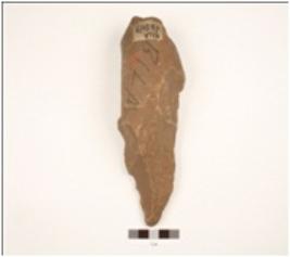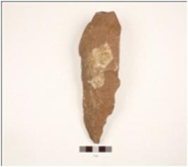 | Description / विवरण | Handaxe made on end struck quartzite flake, flake scars on both surface, cortex on upper surface, triangular in section, wavy cutting edges. |