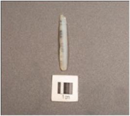 | Description / विवरण | Pen knife shaped chalcedony blade, use-wear edges, mid-ridge on dorsal, defused bulb on proximal end. |